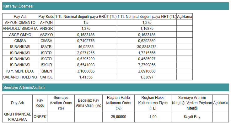 Kamuyu Aydınlatma Platformuna (KAP) yapılan açıklamaya göre, Merkezi Kaydi Sistemde gerçekleştirilen hak kullanım ödemelerine ait kayıtlar şöyle: